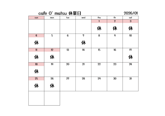 2026年1月のcafe O’ matsu の休業日を以下のようにさせていただきます。