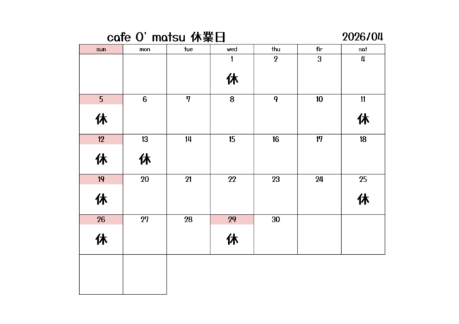 2026年1月のcafe O’ matsu の休業日を以下のようにさせていただきます。